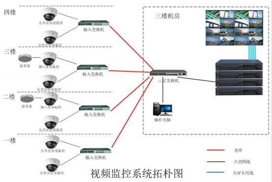 嚴格遵循綜合布線標準,采用六類線、光纖結合的方式; 所有前端網(wǎng)絡攝像機通過六類網(wǎng)線全部連 接到各所屬區(qū)域的接入層交換機,再通過光纖或網(wǎng)絡線連接到監(jiān)控中心的核心交換機。