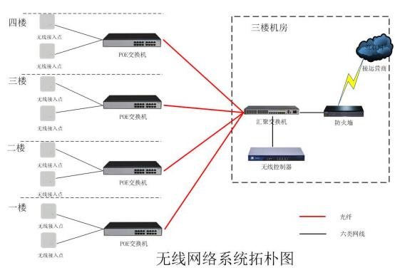 無線網(wǎng)絡采用無線接入點(AP) +無線控制器(AC) 的企業(yè)級無線網(wǎng)絡系統(tǒng)架構,星型拓撲結構。在