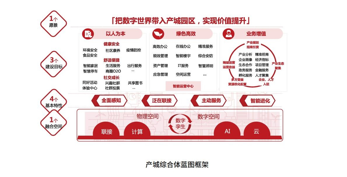 從"智生產(chǎn)"、"智生活"和"智交通"三個維度,列示未來智慧產(chǎn)城綜合體應(yīng)具備的要素與特征,指導(dǎo)智慧園區(qū)規(guī)劃與建設(shè),打造業(yè)務(wù)多樣化、設(shè)施智能化、管理數(shù)據(jù)化和服務(wù)主動化的產(chǎn)城綜合體。